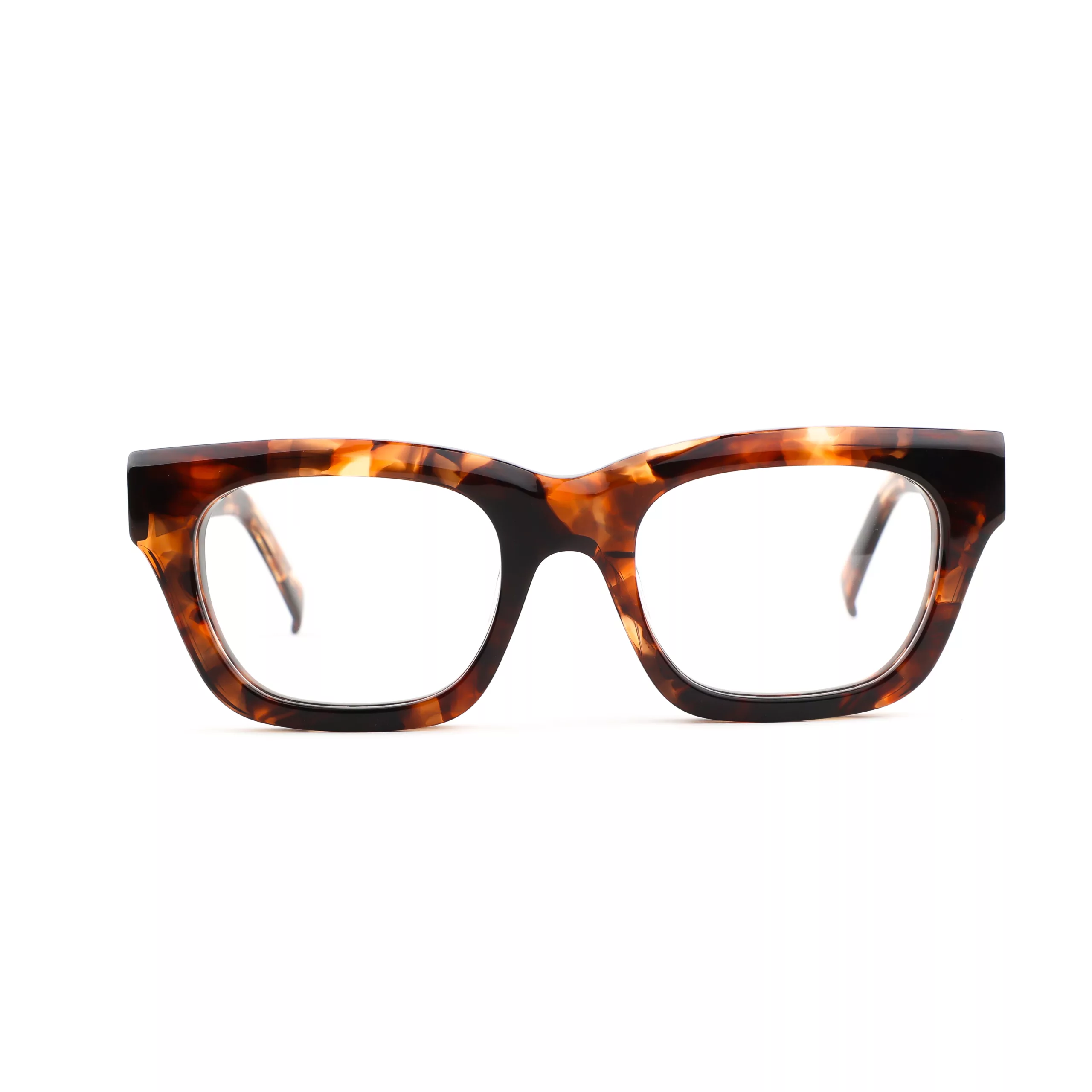 Lunettes de vue en acétate au motif écaille de tortue élégant. Monture épaisse de style carré aux lignes audacieuses, alliant des nuances de brun, d’ambre et de noir. Le design rétro-chic présente des branches larges avec un détail texturé subtil. Parfaites pour un look vintage affirmé et sophistiqué.