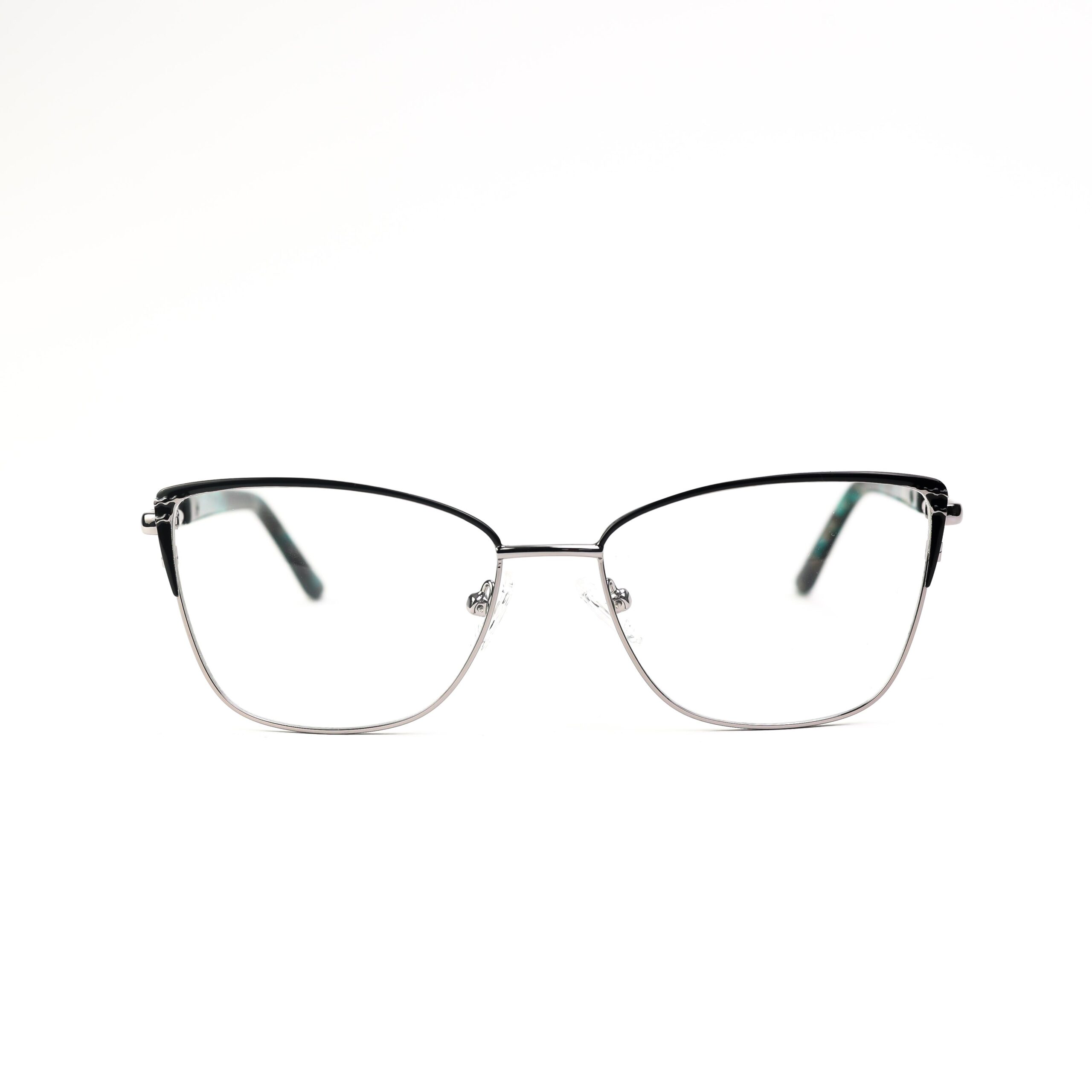 Lunettes de vue pour femmes. La monture presente une face en métal bicolor noir et gris, Les branche sont un mix entre du métal cislé et de l’acétate hypoallérgénique.