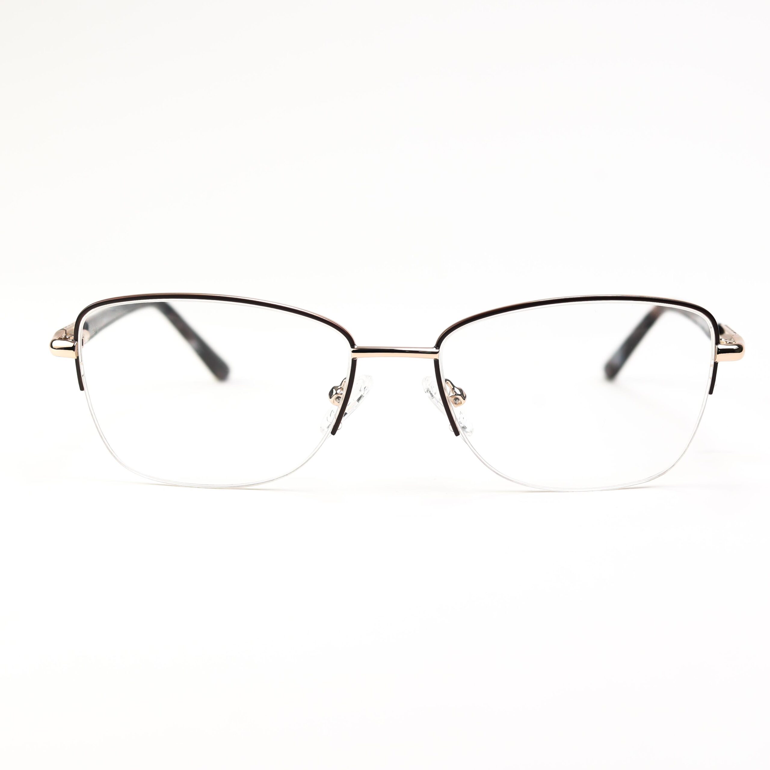 Lunettes de vue pour femmes. La monture en métal doré est habillée d’une couleur marron discret avec montage nylor. Les branches sont constituées d’une partie en métal cislé et d’acétate laminé sur le reste.