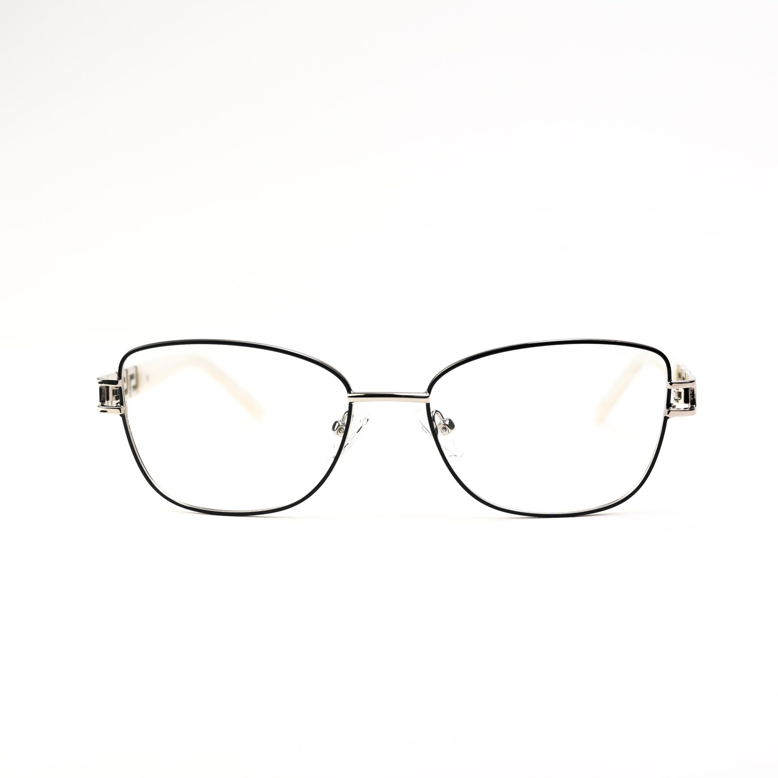 Lunettes de vue pour femmes. Monture en métal gris et noir avec des branches combinées entre métal ciselé et acétate laminé blanc. Forme réctangulare et design classique mais élégant.