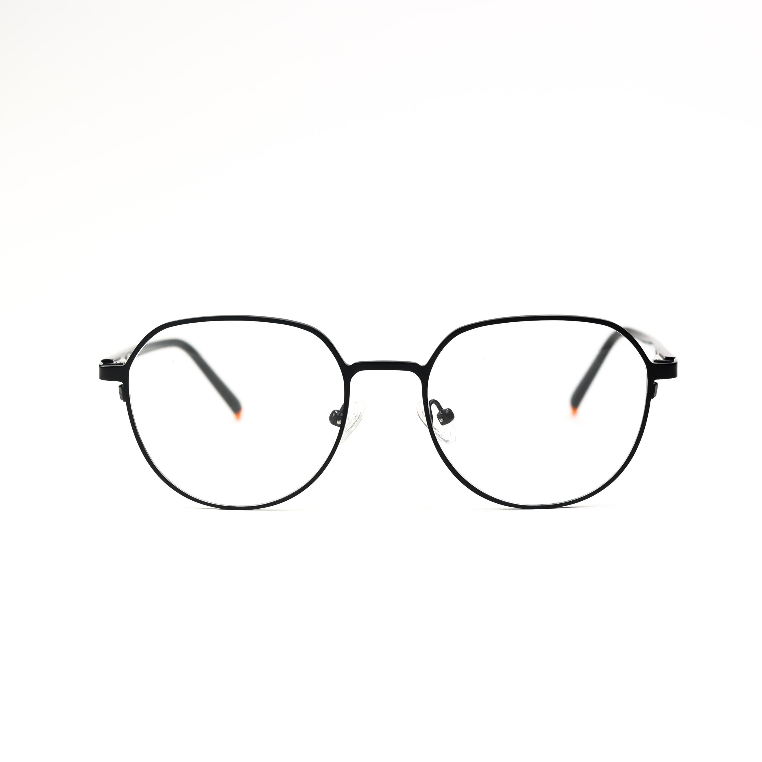 Lunettes de vue unisexe. Cette monture en métal noir et des branches en acétate, incarne une élégance intemporelle avec sa forme pan coupé aux lignes affirmées et son design subtil.