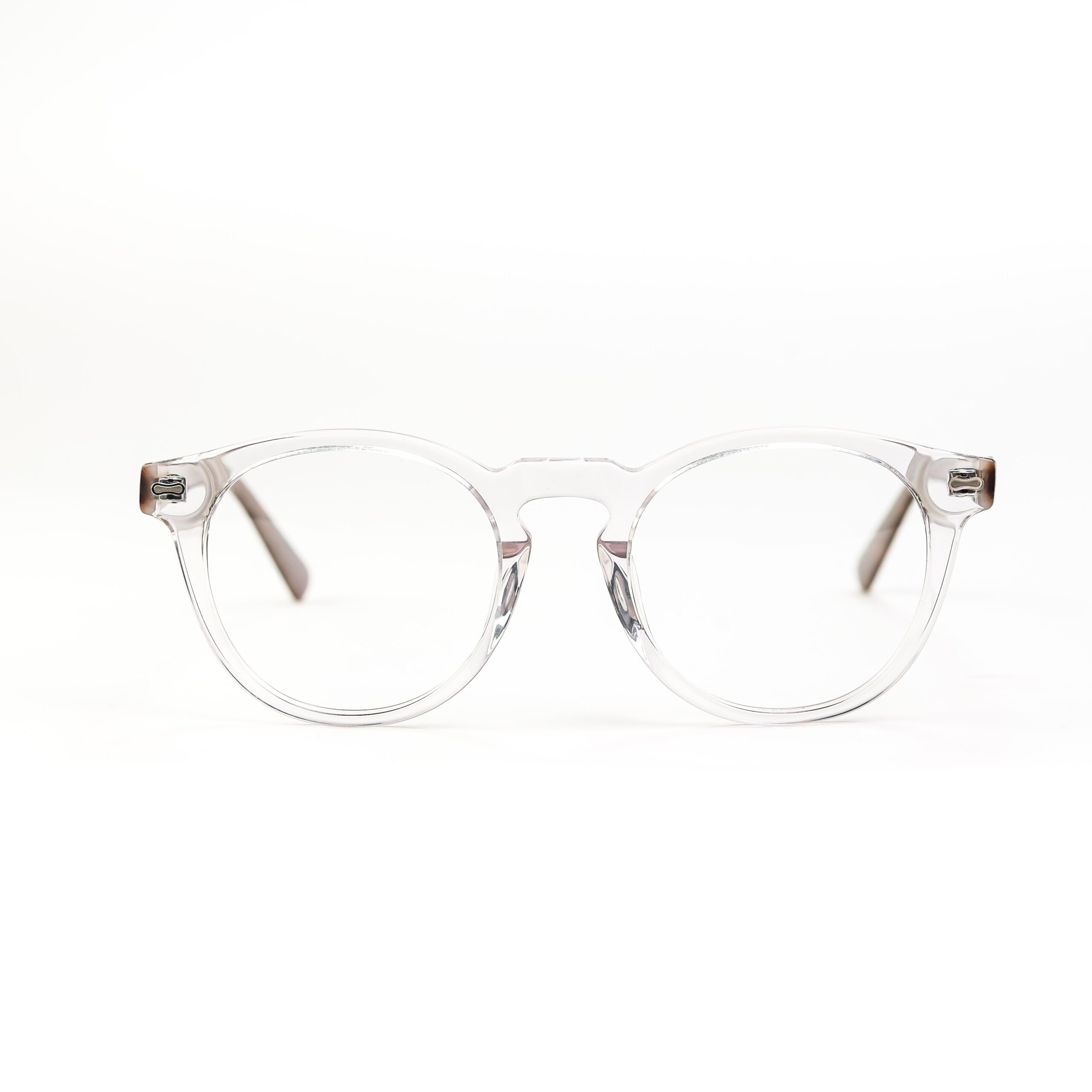 Lunettes de vue unisexe. Monture en acétate transparent, allie élégance classique et forme ronde intemporelle. Les branches fines couleur écaille lui confère un style sobre et raffiné.