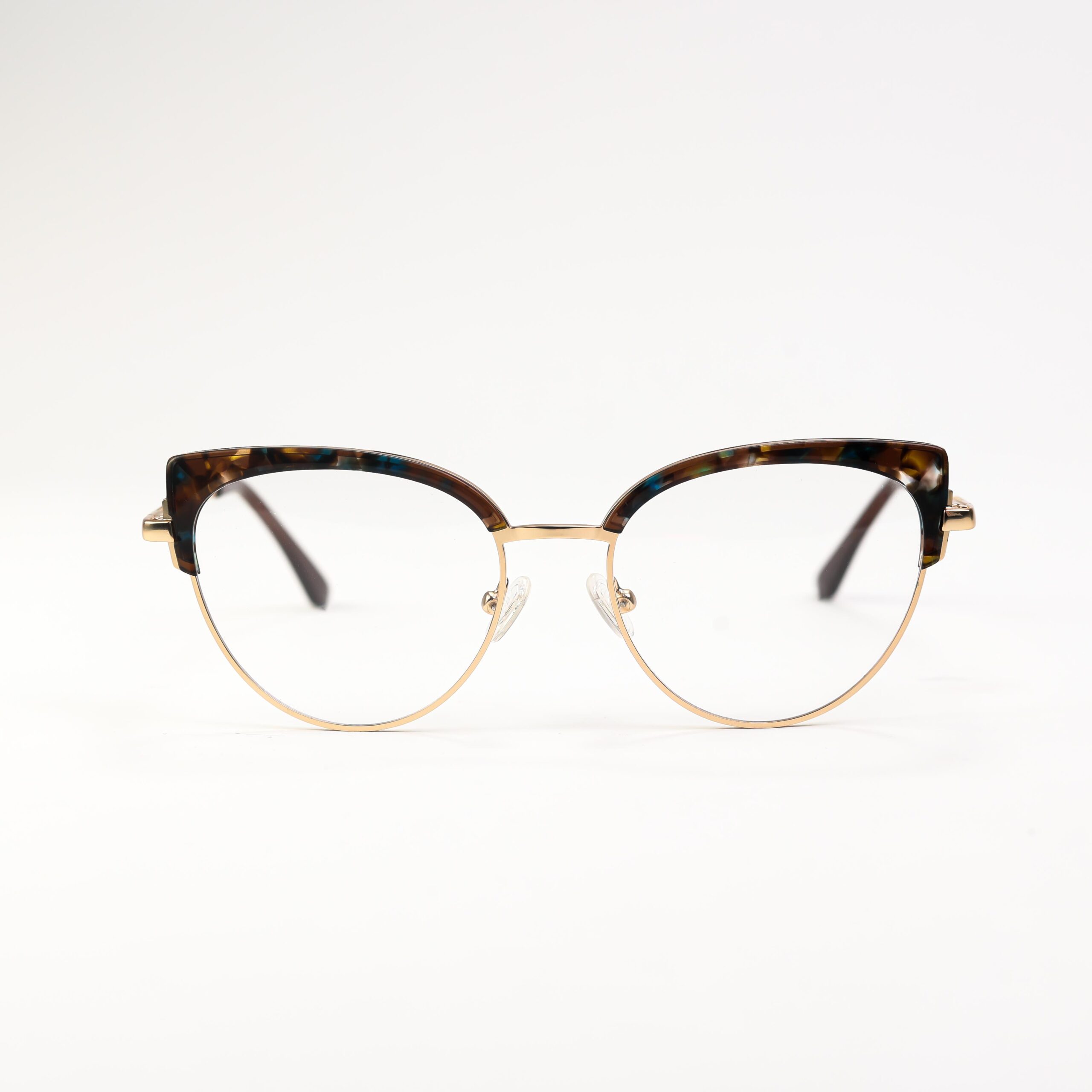 Lunettes de vue pour femmes qui recherchent l’originalité et la simplicité. Cette monture en forme de papillon et une combinaison de matériau: acier inoxydable et acétate laminé et mariage de couleur entre le doré mat et un marron.