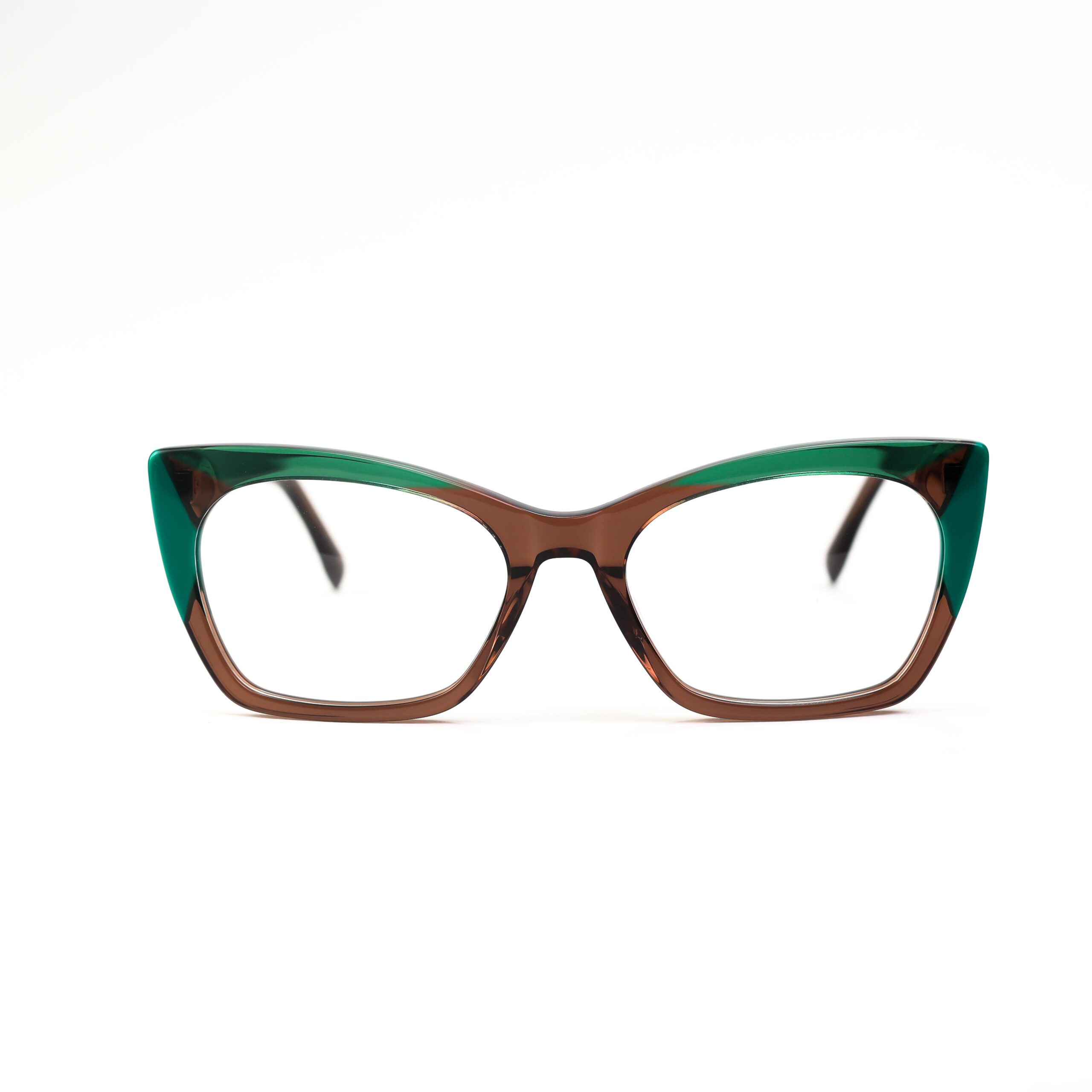 Lunettes de vue pour femmes. Monture en acétate laminé à la forme réctangle papillonante. Les associassions de couleurs en font un véritable atout pour les amateurs de lunettes uniques.
